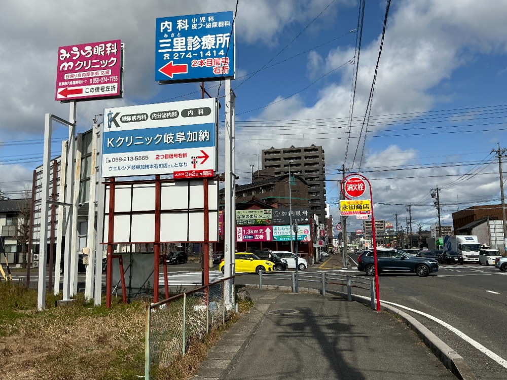 Kクリニック様(岐阜市加納本石町1丁目20ー1)野立看板を岐阜市竜興町信号交差点に 2月28日施工させて頂きました。